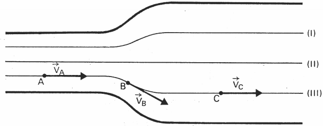 Nos pontos A,B e C,uma partícula do líquido tem,respectivamente,as velocidades: