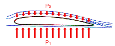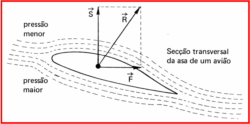 Quando um avião se desloca horizontalmente ou com uma pequena inclinação para cima, a velocidade do ar acima da asa é maior do que na sua face inferior; consequentemente, a pressão do ar é maior embaixo do que em cima da asa.