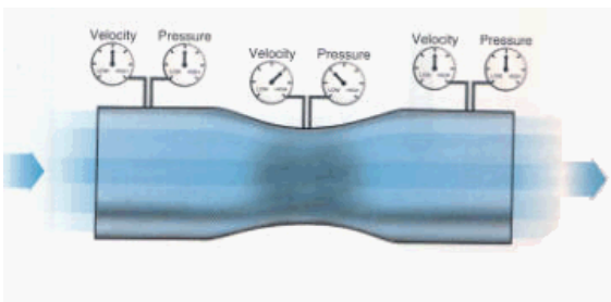 Em resumo, nos condutores de seção variável, nas regiões mais estreitas, a pressão é menor e a velocidade de escoamento é maior.