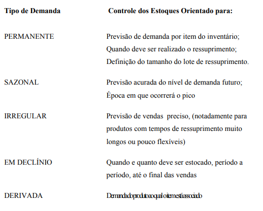 A relação abaixo indica o controle a ser exercido sobre os estoques, conforme o tipo de demanda: