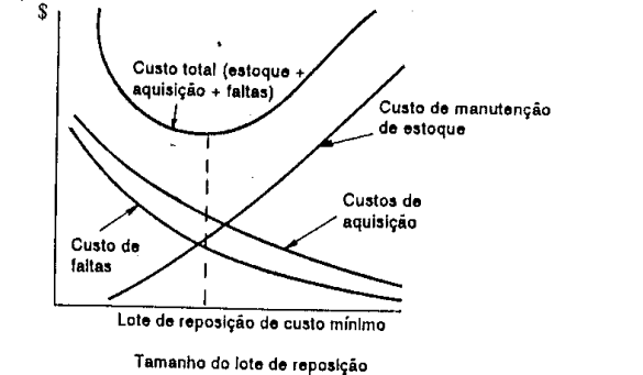 Os lotes econômicos são justamente aqueles que permitem o equilíbrio dos custos de manutenção de estoques, aquisição e faltas, associados a um nível de serviço adequado, em função do comportamento conflitante dos mesmos. A figura seguinte revela o comportamento dos custos, correspondentes aos itens que compõem os custos dos estoques. Os custos de manutenção dos estoques aumentam à medida que são estocados lotes maiores, mas isso resulta em menor número de pedidos e portanto em menores custos de aquisição e faltas. O somatório dos custos tem forma de U.