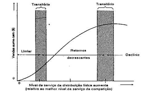 O nível de serviço A corresponde àquele oferecido pela concorrência. À medida que o mesmo cresce, as vendas continuam a aumentar, mas a uma taxa menor do que entre O e A; esta região. (AC) é denominada de retornos decrescentes, na qual opera a maioria das empresas. As vendas, naturalmente, não crescem indefinidamente mas atingem um ponto máximo, (nível C). Se alguns itens do nível de serviço oferecido, no entanto, se intensificarem ainda mais, como visita de vendedores para levantar o nível de estoque e outros, os clientes começam a ficar saturados e as vendas caem.