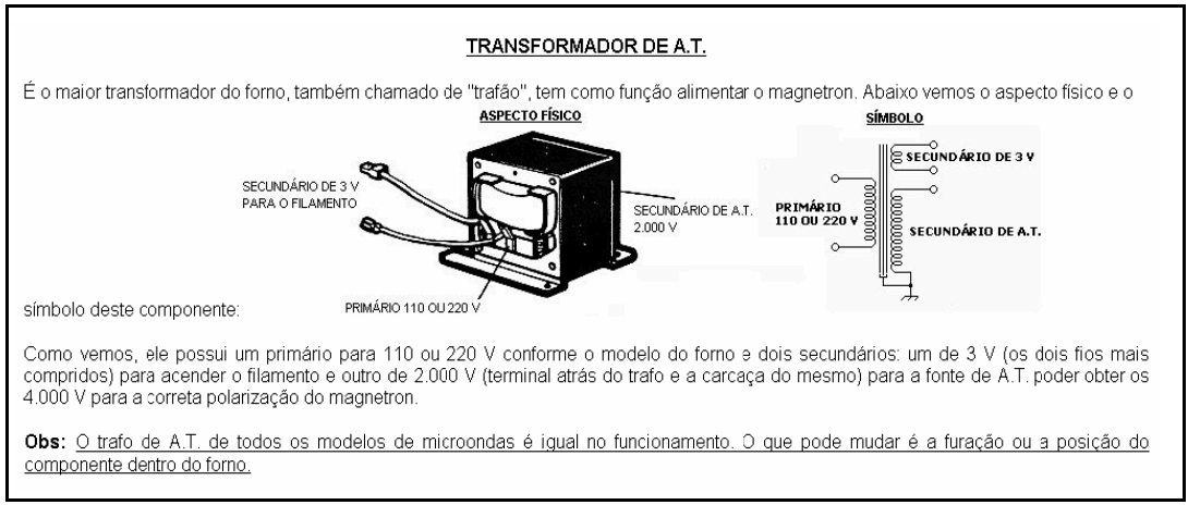 O transformador tem um primário para 110 ou 220 V (dependendo do modelo de forno) e dois secundários, um de 2.000 V e outro de 3 V. O capacitor de filtro tem um resistor embutido para descarregá-lo assim que o forno é desligado.