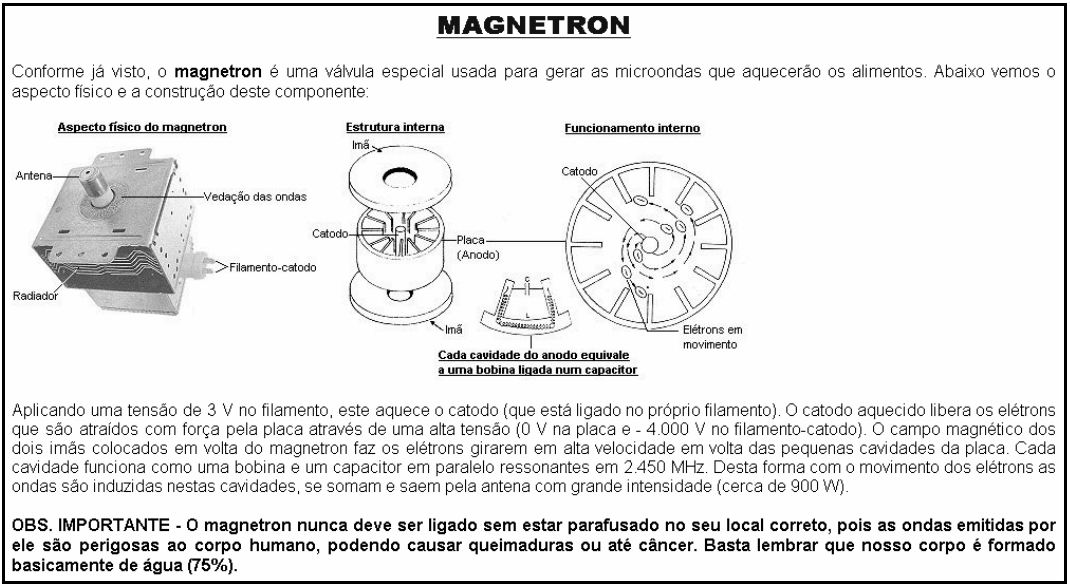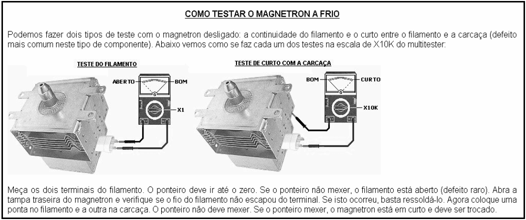 - Quando o terminal de cima do secundário fica positivo, o diodo conduz e carrega o capacitor com - 2.000 V. Quando o terminal de cima fica negativo, o diodo não conduz e a carga do capacitor (- 2.000 V) se soma com a tensão do secundário (- 2.000 V), resultando numa tensão contínua de - 4.000 V aplicada no filamento-catodo do magnetron.Abaixo falaremos sobre os componentes deste circuito e a forma de testá-los: