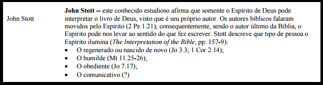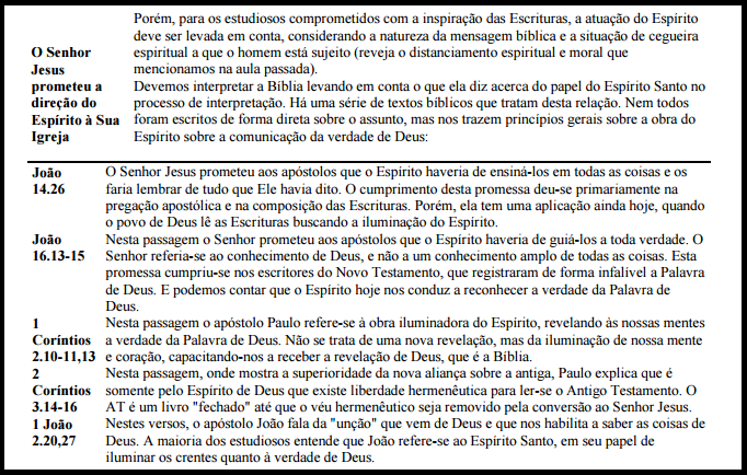 Esta posição sugere que sem a iluminação do Espírito ninguém pode entender a sua mensagem. Aos crentes humildes, obedientes e comunicativos, Deus concede o verdadeiro sentido das Escrituras.