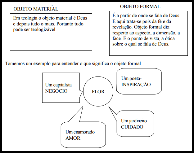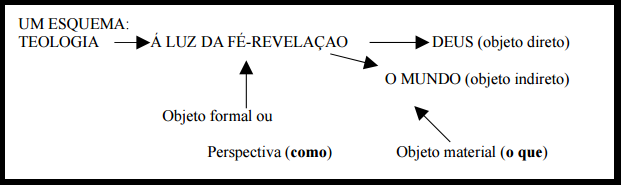 O objeto do material: o objeto material é o sobre o que se processa o conhecimento. Em teologia o objeto material é Deus. Mas não só Deus. É Deus e tudo o mais. Tudo pode ser objeto quando lido a luz da fé e da revelação. A teologia não tem por objeto um objeto entre outros. E aqui se distingue a teologia de outras ciência que sempre tem um objeto particular e não vê a partir do todo. Deus é determinante de tudo, e então qualquer objeto pode ser objeto do teólogo. (uma flor, um ato, um ente da criação, um acontecimento da história) É evidente que Deus é o primeiro objeto. O mundo, o homem são objetos segundos. Como diz Tomás: “A teologia não trata por igual de Deus e das criaturas, mas de Deus principalmente, e das criaturas na medida em que se relacionam com Deus como a seu princípio ou fim”. É aqui que entra a teologia da libertação e que fala da história e das lutas dos pobres dizendo que estão falando de Deus. Se não se tem essa compreensão pode-se achar que o homem e a história não são lugares teológicos. Sob o enfoque de Deus toda a criação pode ser tratada.