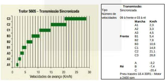 A caixa de marchas deve apresentar diversas velocidades para facilitar regulagens em operações agrícolas que a velocidade do trator tem influência na qualidade da operação. A Figura 7 ilustra a escala de velocidades do trator John Deere modelo 5605. Observe que o trator apresenta nove velocidades à frente e três velocidades à ré.