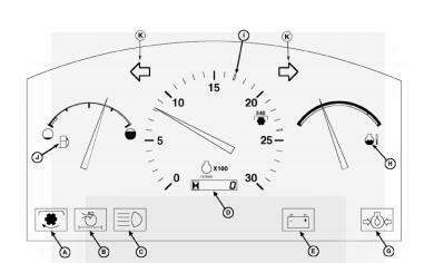 Figura 15. Componentes básicos do painel de um trator agrícola. A-TDP; B-Restrição de ar; C-Luz alta; D-Horímetro; E- Bateria; G-Pressão do óleo; H-Termômetro; I-Tacômetro; J-Combustível; K-piscapisca.