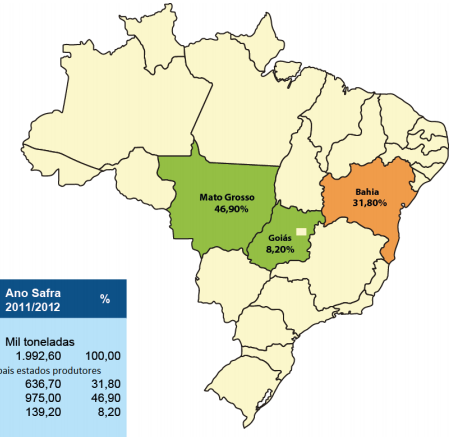 Apesar de que o algodão no país venha tendo alguma expansão em outros estados brasileiros, atualmente a produção ocorre predominantemente em três estados, Mato Grosso, Bahia e Goiás, como pode ser visto no mapa abaixo. A liderança pertence ao Mato Grosso que em 2011 produziu 46,9% do algodão em pluma, seguido pela Bahia com 31,8% e Goiás, 8,2%.