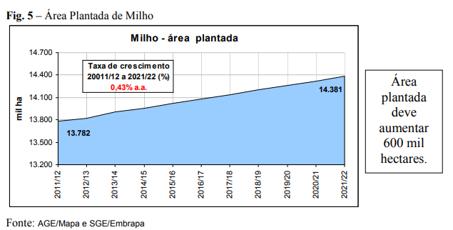 As projeções de produção de milho no Brasil indicam um aumento de 16,3 milhões de toneladas entre as safras 2011/2012 e 2021/2022. Em 2021/2022 a produção deverá situar-se em 70,4 milhões de toneladas, e o consumo em 58,8 milhões. Esses resultados indicam que para atender esse consumo o País deverá ter um excedente da ordem de 11,4 milhões de toneladas para atender as exportações e formação de estoques. Neste caso, as exportações teriam que situar-se no seu nível inferior que deverá se de 3,0 milhões de toneladas Para atender ao montante projetado da exportação de milho em 2021/22, de 14,2 milhões de toneladas, a produção teria que se aproximar mais de seu limite superior, que é maior do que 70,4 milhões de toneladas.