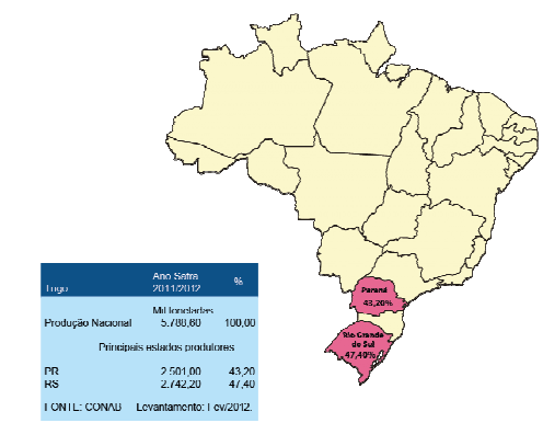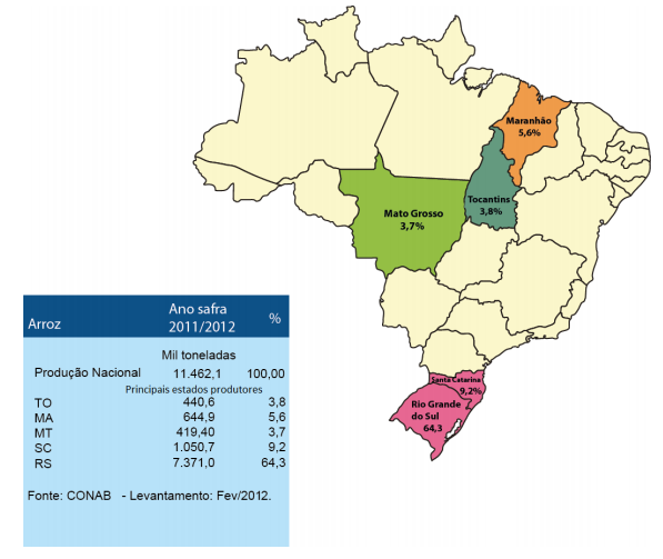 A produção nacional de arroz está distribuída pelos seguintes estados: Rio Grande do Sul, Apesar de que o Arroz é uma cultura comum em quase todo o país, a maior parte da produção ocorre em 5 estados – Rio grande do Sul, onde predomina o arroz irrigado, concentra 64,3% da produção de 2011, Santa Catarina, 9,2% da produção, Mato Grosso, 3,7%, Maranhão, 5,6% e Tocantins com 3,8% da produção nacional.