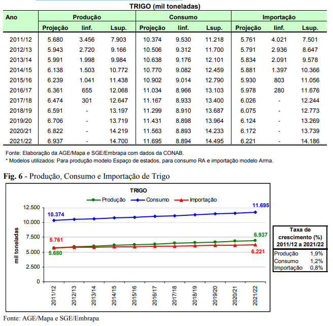 A produção projetada de trigo para 2021/2022 é de 6,9 milhões de toneladas, e um consumo de 11,7 milhões de toneladas no mesmo ano. O consumo interno de trigo no País deverá crescer em média 1,2% ao ano, entre 2011/12 e 2021/2022. O abastecimento interno exigirá importações de 6,2 milhões de toneladas em 2021/2022. Apesar da produção de trigo crescer nos próximos anos em ritmo de 1,9% ao ano, superior, portanto ao consumo, mesmo assim o Brasil deve manter-se como um dos maiores importadores mundiais.