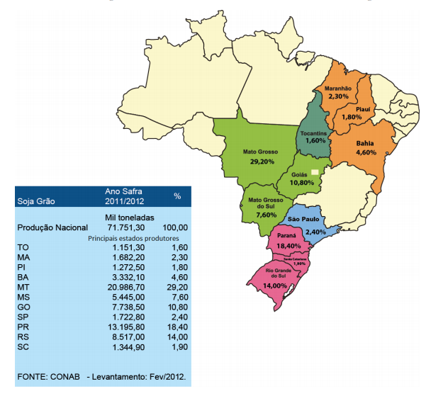 Soja Grão:Atualmente a produção de soja no Brasil é liderada pelos estados de Mato Grosso, com 29,2% da produção nacional; Paraná com, 18,4%; Rio Grande do Sul com 14,0%, e Goiás, 10,8%. Mas, como se observa no mapa, a produção de soja está evoluindo também para novas áreas no Maranhão, Tocantins, Piauí e Bahia, que em 2012 respondem por 10,4% da produção Brasileira.