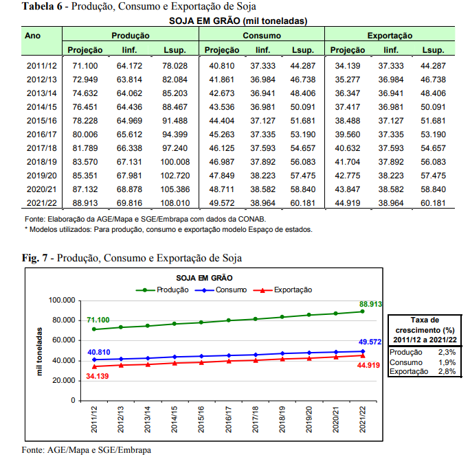 As exportações de soja em grão projetadas para 2021/2022 são de 44,9 milhões de toneladas. Representam um aumento de 10,8 milhões de toneladas em relação a quantidade exportada pelo Brasil em 2011/12. A taxa anual projetada para a exportação de soja em grão é de 2,8%.