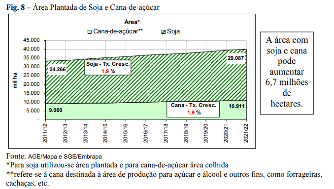 A soja deve expandir-se por meio de uma combinação de expansão de fronteira em regiões onde ainda há terras disponíveis, ocupação de terras de pastagens e pela substituição de lavouras onde não há terras disponíveis para serem incorporadas. A Figura ilustra as projeções de expansão de área em cana de açúcar e soja, que são duas atividades que competem por área no Brasil. Conjuntamente devem apresentar nos próximos anos uma expansão de área de 6,7 milhões de hectares, sendo 4,8 milhões de hectares de soja e 1,9 milhão de hectares de cana-de-açúcar. As demais lavouras devem ter pouca variação de área nos próximos anos. Mas, estima-se que essa expansão deve ocorrer em áreas de grande potencial produtivo, como as áreas de cerrados compreendidas na região que atualmente é chamada de Matopiba, por compreender terras situadas nos estados de Maranhão, Tocantins, Piauí e Bahia. O Mato Grosso deverá perder força nesse processo de expansão de novas áreas, devido principalmente aos preços de terras nesse estado que são mais que o dobro dos preços de terras de lavouras nos estados do Matopiba (FGV - FGVDados). Como os empreendimentos nessas novas regiões compreendem áreas de grande extensão, o preço da terra é um fator decisivo.