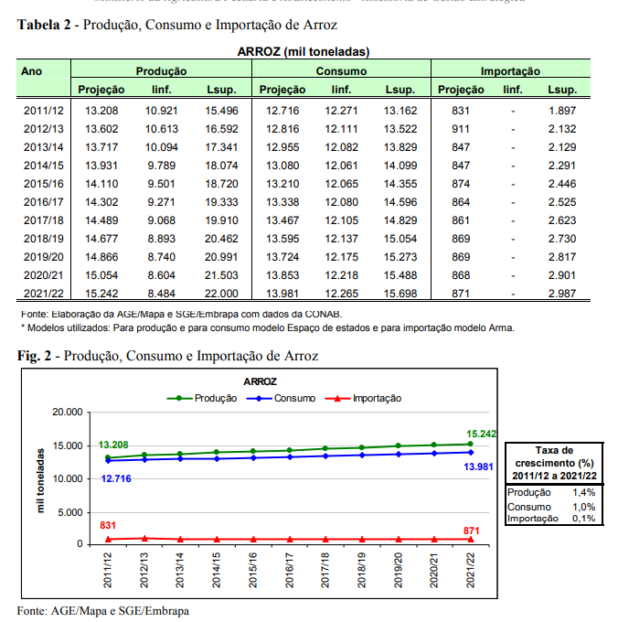 As projeções de produção e consumo de arroz mostram uma situação apertada entre essas duas variáveis, havendo necessidade de importações de arroz nos próximos anos. A produção projetada para 2021/2022 é de 15,2 milhões de toneladas. Equivale a um crescimento anual da produção de 1,4% de 2011/2012 a 2021/2022. Esse acréscimo de produção deverá ocorrer especialmente por meio do crescimento do arroz irrigado, já que o arroz de terras secas tem reduzido sua expansão no Brasil devido à menor incorporação de novas terras em áreas de fronteira agrícola. O caso mais típico é Mato Grosso, cuja produção vem se reduzindo acentuadamente devido a redução do cultivo de variedades de sequeiro.