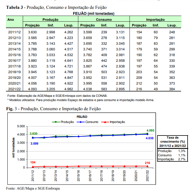 Como o arroz, o feijão é parte da cesta básica dos brasileiros. O feijão tem uma taxa anual projetada de aumento da produção de 1,3% e consumo ao redor de 1,1% ao ano, para o período 2011/2012 a 2021/2022. Neste último ano da projeção a produção esperada para o país é de 4,0 milhões de toneladas. A produção de feijão é muito ajustada ao consumo (IBGE/Cepagro - Ata de 06 de janeiro de 2011). O consumo médio anual desse produto tem sido de quase 4,0 milhões de toneladas, exigindo pequenas quantidades de importação. As projeções de produção e consumo indicam que pode haver alguma importação de feijão nos próximos anos. Porém, a magnitude dos números de importação, entre 150 mil e 250 mil toneladas nos próximos anos. Nos últimos 13 anos, o Brasil tem importado uma média anual de 117 mil toneladas desse produto (Conab, 2012)