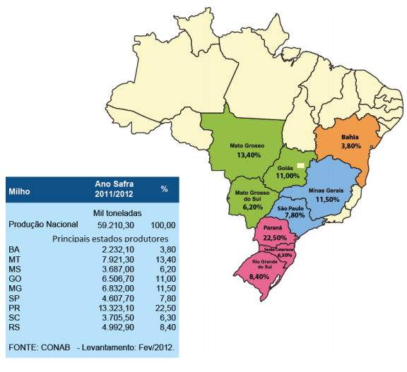 A produção nacional do milho é relativamente dispersa no país. Mas as maiores regiões produtoras são o Sul, com 37,2% da produção nacional e o Centro Oeste com 30,6%. No Sul a liderança é do Paraná, e no Centro Oeste, Mato Grosso. Estes são atualmente os principais produtores de milho do país.