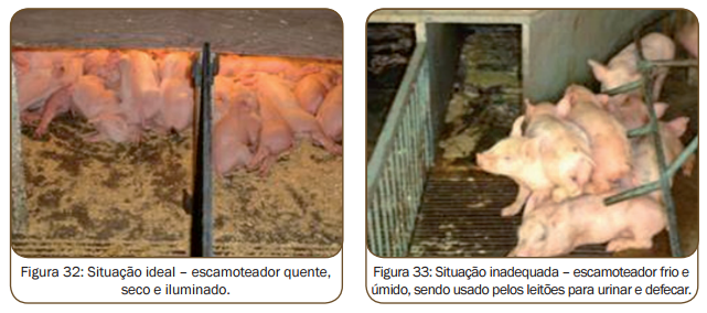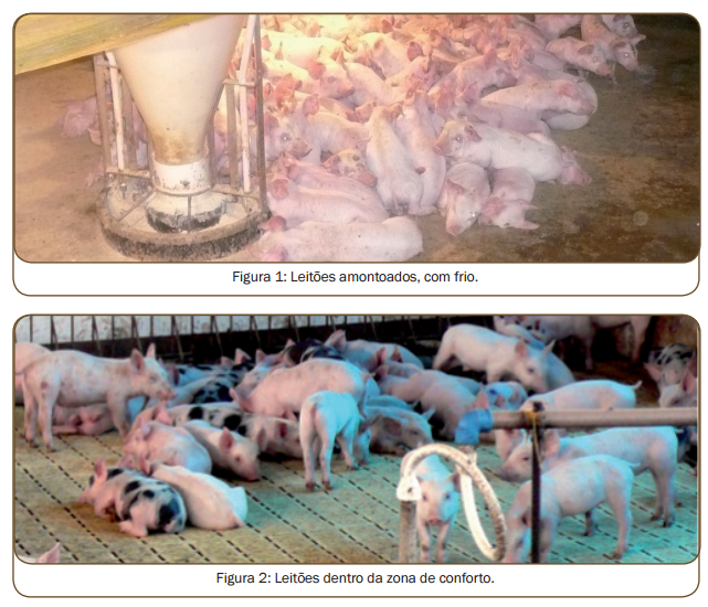 Os sinais comportamentais dos suínos nos demonstram, independente da temperatura ambiente, a sensação térmica e o conforto dos animais (fi gura 2). Leitões amontoados demonstram desconforto e sensação de frio (fi gura 1). Por outro lado, leitões ofegantes e espalhados demonstram sensação de calor excessivo.
