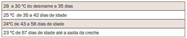 Entretanto, em algumas situações, nem sempre apenas o uso de cortinas é sufi ciente para garantir o conforto térmico dos leitões, especialmente nas primeiras semanas de creche. Portanto, faz-se necessário dispor de alternativas para manter a temperatura ideal em cada fase. A temperatura ideal para a fase de creche é de: