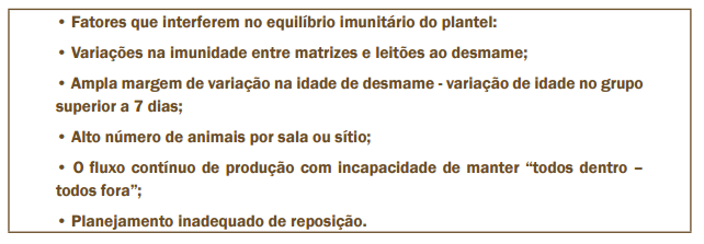 O sistema de produção deve ser entendido de forma dinâmica, de maneira que a formação de cada grupo de cobertura, parição, desmame e terminação estabeleça um comportamento que mostre um equilíbrio entre os microrganismos e os animais, determinando, desse modo, a estabilidade imunológica.