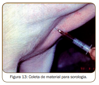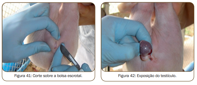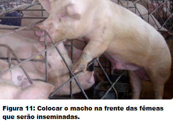 Normalmente, as fêmeas fi cam alojadas em gaiolas e o macho colocado em frente às fêmeas desmamadas diariamente, duas vezes ao dia, e devem ser pesquisados os sinais de cio. Os sinais de cio são edema e hiperemia da vulva (figura 10), orelhas eretas (figura 9) e o reflexo de tolerância ao homem na presença do cachaço, onde a fêmea fica completamente parada na presença do macho adulto (figura 7 e 8).