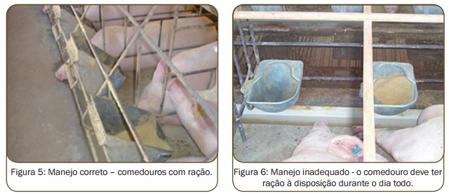 Para realização do flushing adequadamente em marrãs alojadas nas gaiolas, é indispensável utilizar os comedouros acessórios, conforme indicam as fi guras 5 e 6, para que elas tenham ração à disposição durante todo o dia. Nas baias, com comedouros lineares, é possível fazer o flushing, apenas deixando ração à vontade.