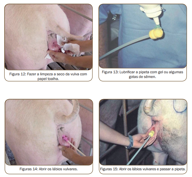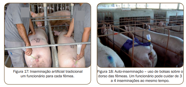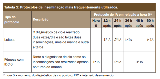 As fêmeas que estiverem em cio deverão ser incluídas em um protocolo de inseminação. Duas possibilidades estão descritas na tabela 1. Utilizam-se duas a três doses de sêmen com três bilhões de espermatozoides cada, distribuídas durante o cio em intervalos regulares, uma ou duas vezes ao dia.
