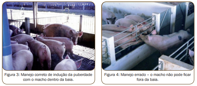 Juntamente com a adaptação sanitária, recomenda-se dar início ao manejo de indução da puberdade. Esse procedimento consiste em colocar a fêmea jovem em contato com um macho adulto (com mais de 10 meses de idade) e saudável, duas vezes ao dia, durante 15 minutos, permitindo um contato focinho a focinho entre ambos. Como as leitoas estão alojadas em baias nessa fase, o macho deve entrar nesse local e dispor de tempo sufi ciente para estabelecer contato com todas as fêmeas (fi guras 3 e 4). Deve-se observar o rodízio de machos para renovação e variação do estímulo.
