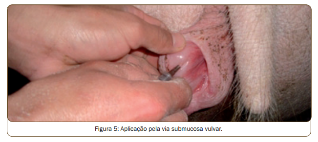 Os produtos utilizados são o dinoprost ou coprostenol sódico, nas doses recomendadas nas suas bulas, podendo ser aplicados pela via intramuscular com agulha 40x12 ou na submucosa vulvar (figura 5) com agulha de insulina (13 x 4,5).