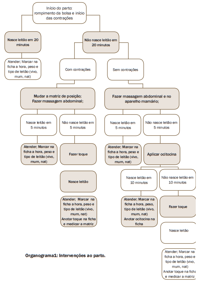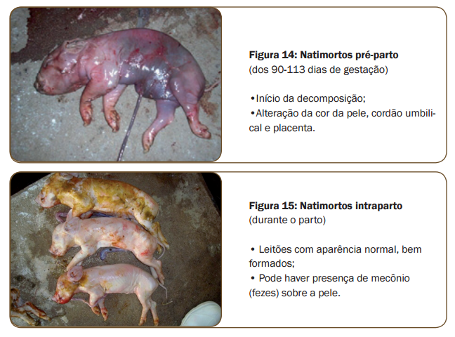 É importante utilizar fichas de parto, registrando a hora de nascimento de cada leitão, visando a auxiliar na decisão de intervenção. Da mesma forma, pode-se anotar as intervenções (carbetocina ou ocitocina, toque e aplicação de medicamentos), peso ao nascimento e o tipo de leitão: vivo, natimorto ou mumificado (figuras 13 a 15).