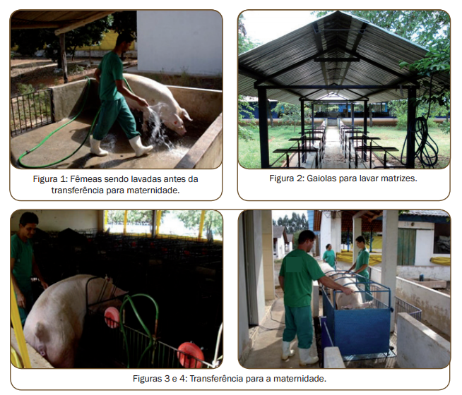As fêmeas que serão transferidas devem ser lavadas com escova, água e sabão, dando especial atenção à região posterior, aparelho locomotor e mamário. Pode-se ter um local especial para lavar os animais de forma a dar mais segurança e conforto a quem for realizar a tarefa. Recomenda-se também evitar lavar os animais em grupo, principalmente quando alojados na gestação em gaiolas individuais, pois podem ocorrer brigas, ferimentos nas fêmeas e até natimortalidade.