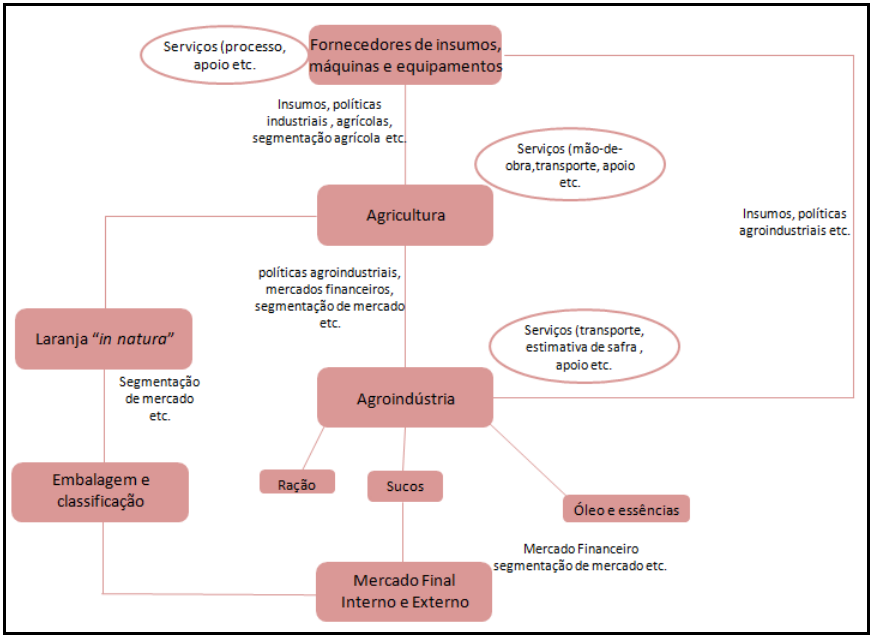 No entanto, a agricultura não pode ser abordada de maneira independente dos outros setores responsáveis por todas as atividades que garantam a produção, deve se considerar a atividade agrícola como parte de uma extensa rede de agentes econômicos que vai desde a produção de insumos, transformação industrial até armazenagem e distribuição de produtos agrícolas e derivados (BATALHA).