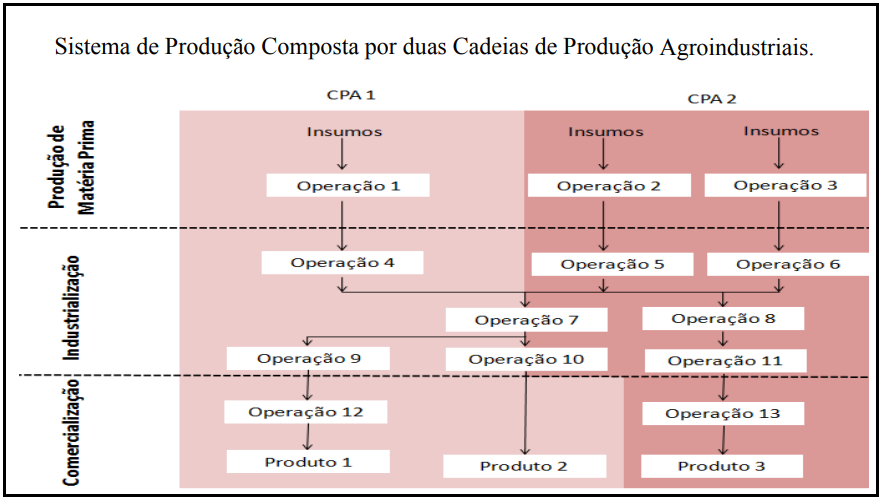 Na figura abaixo, encontra-se um exemplo em disposição de duas cadeias de produção agroindustrial (CPA), observa-se a segmentação em 3 setores (Produção de matériasprimas, Industrialização e Comercialização) cada qual exigindo determinadas operações; dependendo do segmento, as operações podem interagir de forma complementar (operações 7 e 10) para suprir determinada demanda de matériaprima/serviços.