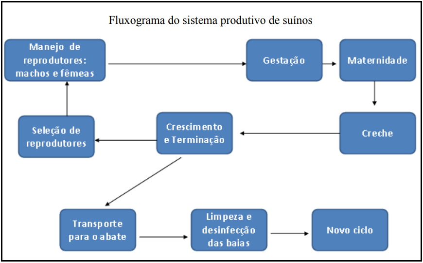 Após o ciclo de crescimento e abate, sucedido pela comercialização, deve-se ater à limpeza e desinfecção do local, até o período de produção do novo ciclo. Estas características são peculiares, principalmente, à suinocultura, avicultura e bovinocultura leiteira. Para maior elucidação, observe na figura o fluxograma de produção da suinocultura.