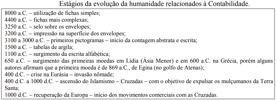 Em sítios arqueológicos do Oriente Próximo, foram encontrados materiais utilizados por civilizações pré-históricas que caracterizaram um sistema contábil utilizado entre 8000 e 3000 a.C., constituído de pequenas fichas de barro. Essas escavações revelaram fatos extraordinários para a Contabilidade, colocando-a como uma mola propulsora da criação da escrita e da contagem abstrata. Pode-se, com base nos autores supra citados, organizar um quadro demonstrativo dos estágios da evolução da humanidade relacionados à contabilidade do período pré-histórico até o surgimento das partidas dobradas.