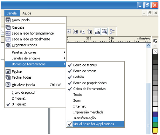 Abra o Corel Draw, e habilite a ferramenta de Macro do VBA. Para habilitar a ferramenta clique no menu “Janela” e aponte o cursor até a opção “Barra de Ferramentas” e habilite a opção “Visual Basic for Applications”.