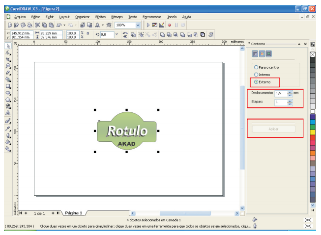 Para adicionar o contorno, com a imagem seleciona clique em: “Efeitos” e marque a opção “Contorno”, na tela de propriedades de contorno deixe marcada a opção “Externo”, no campo “Etapas” deixe o numero “1”, no campo “Deslocamento” informe um valor que sera a borda de contorno de sua imagem, ou seja a distância entre a imagem e o corte. Neste caso não ha um valor padrão, em seguida clique em “Aplicar”.