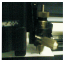 Após posicionar o material já impresso na plotter GCC, deixe a lâmina em cima do encontro de linhas da marcação de registro, e defina que aquele é o ponto inicial de recorte e deixe a plotter on-line.