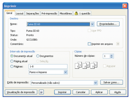 No Corel Draw, clique em “Imprimir”, na caixa de dialogo de impressão, selecione a plotter de recorte conforme o modelo de sua plotter GCC. (Puma III, ou Jaguar IV)