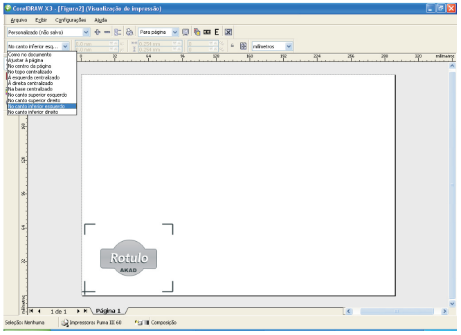 Na tela de visualização, alinhe o trabalho para o “Canto Inferior Esquerdo” conforme figura abaixo, em seguida com a plotter on-line, e lâmina já posicionada na marcação inicial, clique em Imprimir.