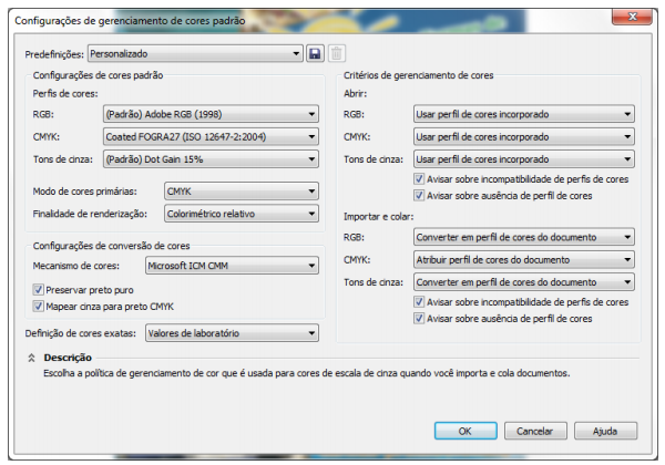 Através do menu ‘Ferramentas’, ‘Gerenciamento de Cores’, ‘Configurações Padrão’, será feita a configuração que servirá de base para todos os arquivos criados para impressão em seu computador.
