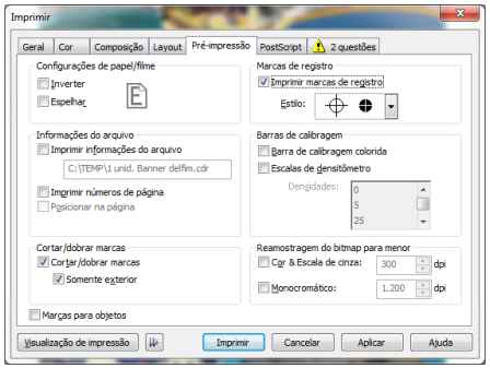 11. O Corel faz um Preflight do seu arquivo e nele pode conter informações importantes, caso o arquivo tenha algum problema. Neste caso ele está apontando apenas que as marcas de impressora não cabem na mídia, mas não se preocupe com isso, apenas as pontinhas das marcas estão fora.