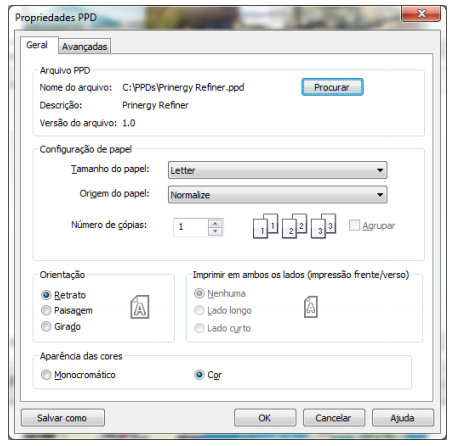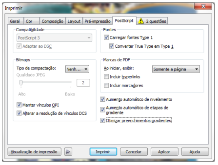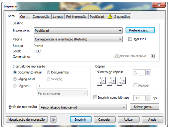 1. Pressione Ctrl+P ou vá até o ‘Menu Arquivo’, ‘Imprimir’. Na tela que aparecerá, selecione a impressora instalada PostScript, em seguida habilite a opção ‘Usar PPD’.