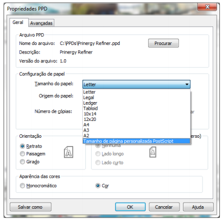 4. No campo ‘Tamanho do papel’ selecione a opção ‘Tamanho de página personalizada PostScript’.