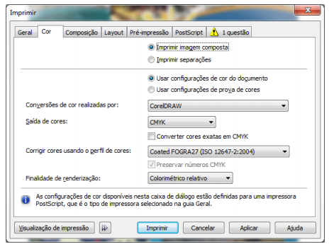 O conselho portanto, é tratar e converter todas as imagens no Photoshop antes de importar para o Corel. Outra observação importante é utilizar o perfil CMYK “Coated FOGRA 27 (ISO 12647-2:2004)” também no Photoshop, pois não é recomendado fazer conversão de cores CMYK para outro perfil CMYK.