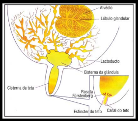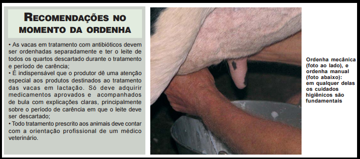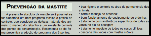 Saúde do úbere – Um dos grandes problemas da atividade leiteira é a mastite, que se manifesta como uma inflamação da glândula mamária causada principalmente por microorganismos provenientes do ambiente e de úberes infectados. A inflamação traduzse por presença de células somáticas em quantidades elevadas e alteradas na composição do leite. As bactérias são as causas primárias de mastite, mas fungos e algumas algas podem provocar a infecção. Trata-se de um dos mais sérios problemas econômicos e sanitários que afetam a produção de leite.
