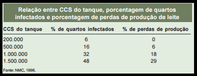 Dessa forma, quanto mais elevada a CCS, maior a severidade da infecção e, conseqüentemente, o prejuízo econômico do produtor. Mesmo na glândula mamária não infectada o número de células somáticas pode chegar a 50.000 por mililitro. Aceitam-se como normais – o que significa que o quarto mamário não está infectado – contagens de até 200.000 células/ml. Estudos têm mostrado que a CCS a partir de 250.000 células/ml indica, com 80% de probabilidade, a presença de infecção no úbere.