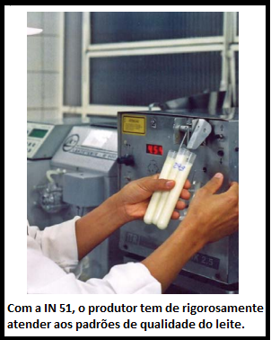 Conforme a IN-51, desde 1º de julho de 2007, o resfriamento do leite é obrigatório para as regiões CentroOeste, Sudeste e Sul do país. A IN-51 também determina que, uma vez por mês, amostras do leite de cada produtor devem ser enviadas pela indústria para análises na Rede Brasileira de Laboratórios de Controle de Qualidade do Leite (RBQL). Os produtores recebem os resultados das seguintes análises: