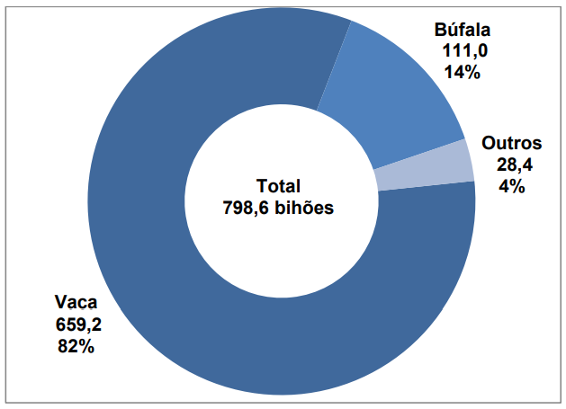 Gráfico 1 - Produção de leite por espécie (bilhões de litros) - 2016